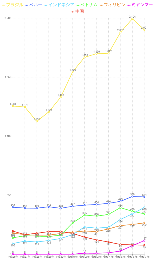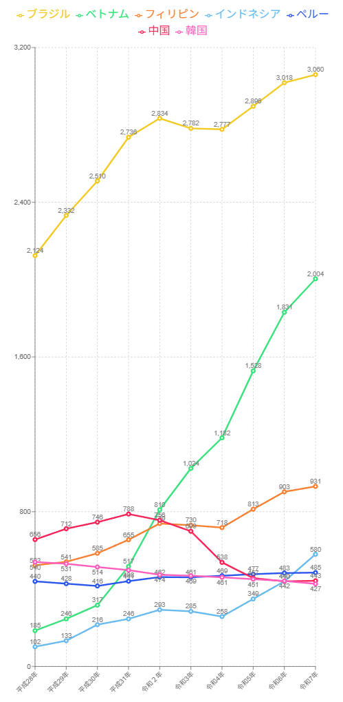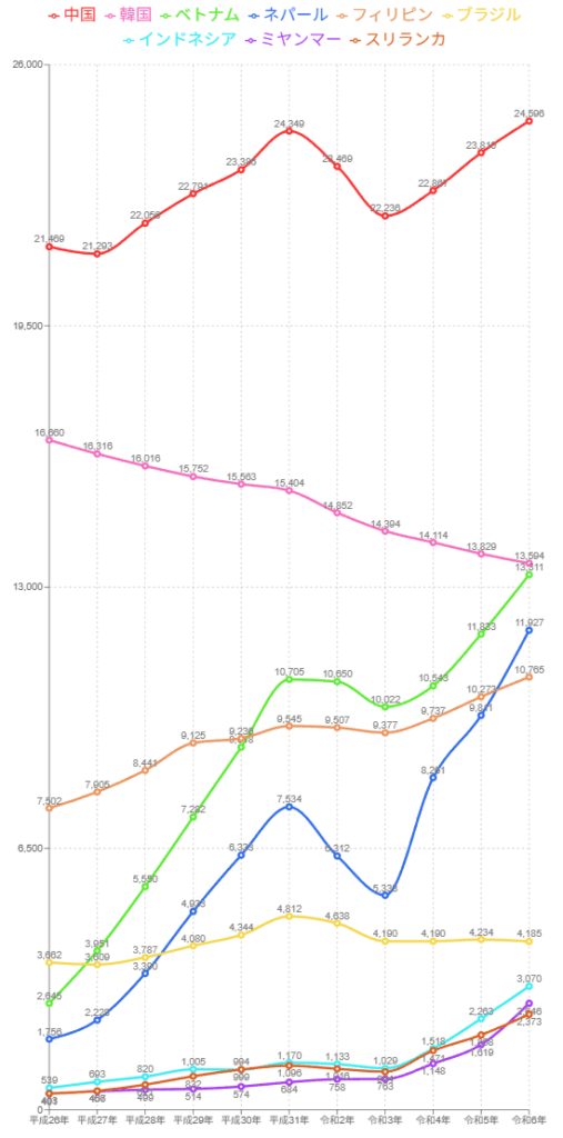 中国 25,822人 韓国 13,525人 ベトナム 14,519人 ネパール 14,319人 フィリピン 10988人 ブラジル 4,263人