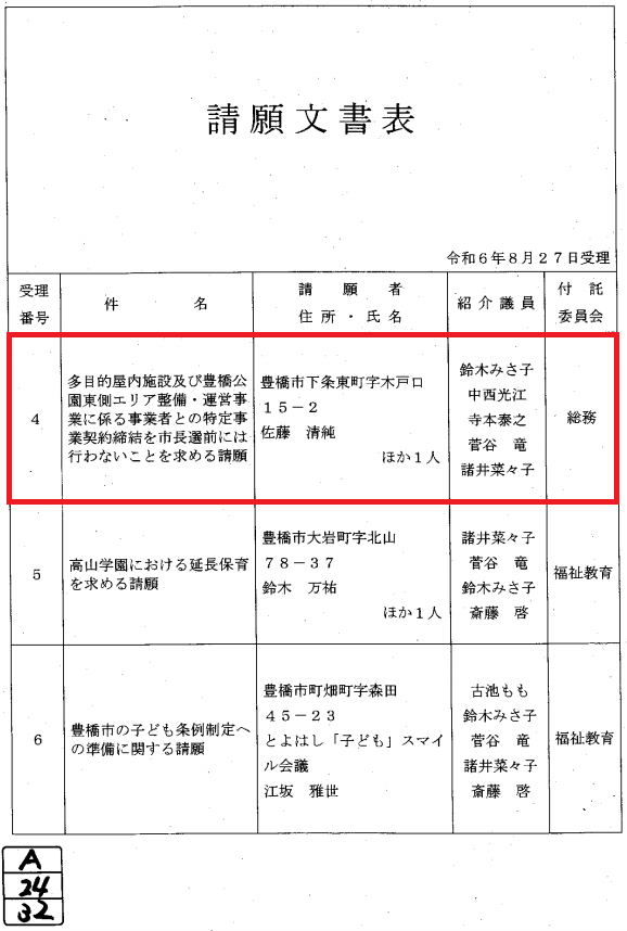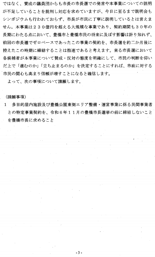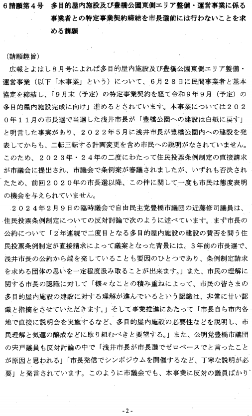 請願書「多目的屋内施設及び豊橋公園東側エリア整備・運営事業に係る事業者との