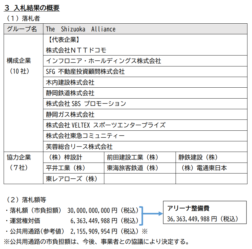 【公表】静岡市の新アリーナ落札は「NTTドコモ」代表のグループ
