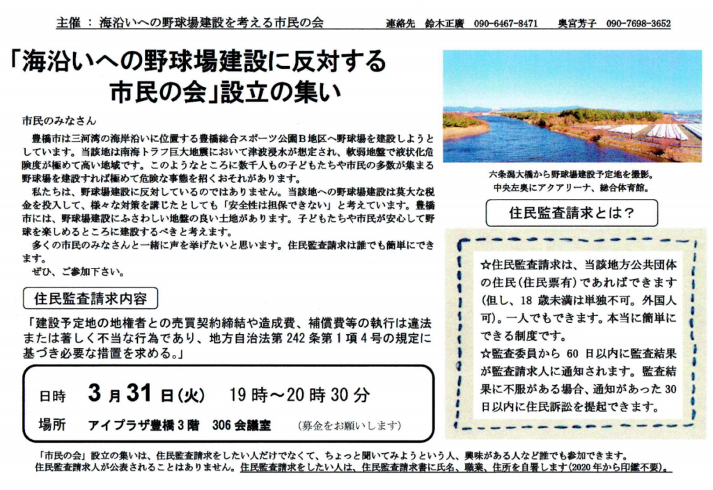 豊橋市総合スポーツ公園B地区に野球場の建設計画を反対する署名であり